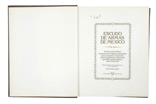 Subasta 710, Lote # 258 HM - Cabrera y Quintero, Cayetano. Escudo de Armas de México. México: Instituto Mexicano del Seguro Social, 1981. fo. marquilla, XCVIII + facsímil. Celestial Protección de Esta Nobilissima Ciudad, de la Nueva España, y de Casi Todo el Nuevo Mundo, María Santíssima, en su Portentosa Imagen del Mexicano Guadalupe, Milagrosamente Aparecida en el Palacio Arzobispal el Año de 1531 y Jurada su Principal Patrona el Passado de 1737. En la angustia que ocasiono la Pestilencia, que cebada con mayor rigor en los Indios, mitigó sus ardores al abrigo de tanta sombra. Encuadernado en pasta dura. Estimado $4,000-5,000