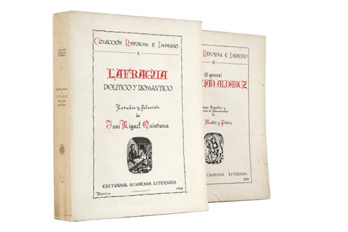 B - Quintana, José Miguel / Muñoz y Pérez, Daniel. Lafragua. Político y Romántico / El General Juan Álvarez. a) Quintana, José Miguel. Lafragua. Político y Romántico. México: Editorial Academia Literaria, 1959. 4o. marquilla, VII + 424 p. Intonso. Pastas gastadas. Encuadernado en rústica. b) Muñoz y Pérez, Daniel. El General Don Juan Álvarez. México: Editorial Academia Literaria. 1959. 4o. marquilla, VIII + 519 p. + apartado de ilustraciones. Intonso. Manchas de humedad y óxido. Encuadernado en rústica. Ambos forman parte de la Colección "Reforma e Imperio" en la cual se buscó ahondar en la vida de personajes relevantes de este periódo dentro la Historia de México, realizando un estudio de su vida y obra. Estos ejemplares son los números 1 y 2 respectivamente. Total de piezas: 2. Estimado $4,000-5,000