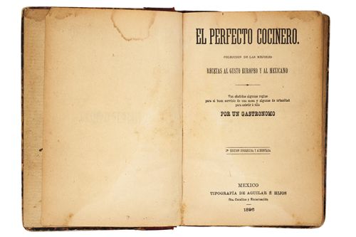 CO - Por un Gastrónomo / Medellín, Anita Vda. de (Advertencia). El Perfecto Cocinero / Cocina Poblana y Tapatía. a) Por un Gastrónomo. El Perfecto Cocinero. Van añadidas algunas reglas para el buen servicio de una mesa y algunas de urbanidad para asistir á ella. México: Tipografía de Aguilar é Hijos, 1896. 16o. marquilla, 192 p. Tercera edición corregida y aumentada. Manchas de humedad, lomo y pastas gastados. Encuadernado en pasta dura, lomo en piel. b) Medellín, Anita Vda. de (Advertencia). Repostería Poblana y Tapatía. 8o., 51 + V p. Última página rasgada. Sin portada. Encuadernado en pasta dura, lomo y puntas en piel. Total de piezas: 2. Estimado $4,000-5,000