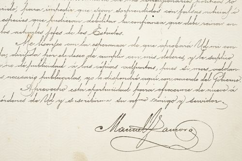 "...Para que Ud. conozca cuales son las pretensiones y las ideas políticas de los partidarios del Señor Comonfort, así como los trabajos emprendidos por este con el auxilio de sus ajentes, para volver al Gobierno de la República, acompaño á esta carta cópias de las que me dirijió de Méjico últimamente Dn. Ezequiel Montes y de mi respuesta.