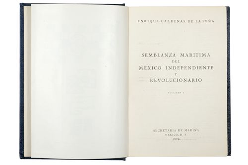 Subasta 710, Lote # 340 MI - Cárdenas de la Peña, Enrique. Historia Naval de México. a) Gesta en el Golfo la Segunda Guerra Mundial y México. México: Editorial Primicias, 1966. 4o., XI + 283 p. Ilustrado con planos, 3 mapas plegados y numerosas fotografías fuera de texto. Primera edición de 3,000 ejemplares. Con dedicatoria. Encuadernado en pasta dura. b) Educación Naval en México. México: Secretaría de Marina, 1967. 4o., XV + 257; X + 404 p. Ilustrado con gran cantidad de reproducciones facsimilares, fotografías y13 mapas plegados. Primera edición de 1,500 ejemplares. Dedicado por el autor. Cubiertas con faltantes. Encuadernados en pasta dura. Piezas: 2. c) Semblanza Marítima del México Independiente y Revolucionario. México: Secretaría de Marina, 1970. 4o., XV + 319; XI + 276 p. Tomo I: 1 plano plegado. Tomo II: estados y planos plegados. Ilustrados con fotografías. Primera Edición de 2,000 ejemplares. Dedicado por el autor. Encuadernados en pasta dura. Piezas: 2. Total de piezas: 5. Estimado $7,000-9,000