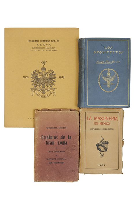 Subasta 710, Lote # 291 HU - Gabinete del Gran Maestro / La Masoneria en México / Fort Newton, José / Supremo Consejo del 33o. Constituciones Generales / Apuntes Históricos / Los Arquitectos. Historia y Estudio de la Masonería / La Hora de la Verdad, 1860-1978. a) Gabinete del Gran Maestro. Constituciones Generales y Estatutos de la Gran Logia de Libres y Aceptados Masones del Distrito Federal. México: Sin pie de imprenta, 1938. 8o. marquilla, 180 p. Reimpresión de la edición de 1884. Lomo y pastas deteriorados. Encuadernado en rústica. Se desconoce alguna copia en records públicos. b) La Masoneria en México. Apuntes Históricos. México: Sin pie de imprenta, 1928. 8o. marquilla, 292 p. Pastas deterioradas. Encuadernado en rústica. Obra rara impresa por su autor en la navidad de 1927, en la que hace un recuento histórico de la masonería en México desde su fundación más remota. c) Fort Newton, José. Los Arquitectos. Historia y Estudio de la Masonería. Barcelona: Editorial de R. Maynadé, 1928. 8o. marquilla, 338 p. Rayones con plumón verde en guardas, portada y pp. 32 - 33. Sellos de antiguo propietario. Lomo por desprenderse, pastas gastadas. Encuadernado en pasta dura. Edición original en inglés (The Architects) en 1918. Esta es la primera traducción al español, realizada por Salvador Valera Aparicio. Contiene temas relacionados con la masonería: herramientas, fe, doctrina, historia, francmasoneria, masones aceptados, gran logia de Inglaterra, masonería universal, conceptos, filosofía y espíritu. d) Supremo Consejo del 33o. R. E. A. y A. Jurisdicción Masónica de los EE. UU. Mexicanos. La Hora de la Verdad, 1860-1978. México: Imprenta Vera, Guadalajara, 1978. 4o. marquilla, 17 p. + 10 h. Edición de 1,000 ejemplares. Profusamente ilustrado con fotografías de personalidades y sedes; con reproducciones de documentos. La Biblioteca del Congreso de Estados Unidos de América resguarda la única copia conocida en bibliotecas públicas. Total de piezas: 4. Estimado $4,000-5,000