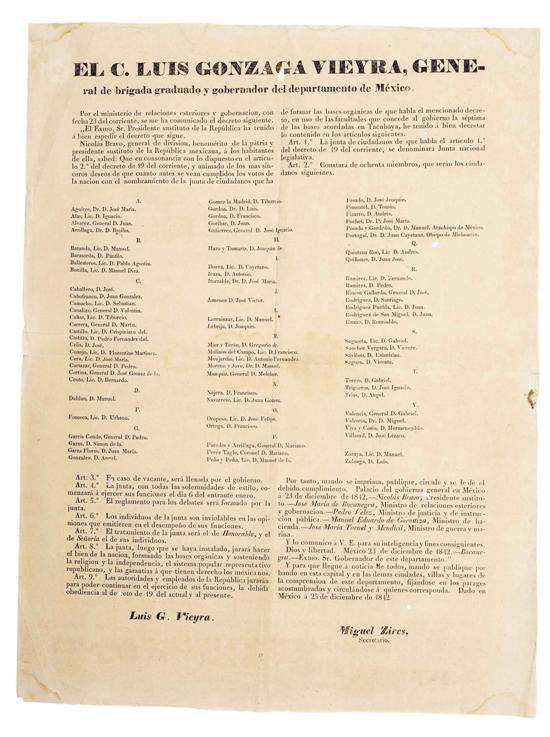 Subasta 710, Lote # 188 D - Bocanegra, José María / Vieyra - Zires, Miguel. Bases Organicás / Decreto. a) Bocanegra, José María. Bases Orgánicas de la República Mexicana. Acordadas por la Honorable Junta Legislativa. Mexico: Imprenta de J. M Lara, 1843. 8o. marquilla, XI + 45 p. Primera edición. Texto amarronado. Encuadernado en rústica. En abril de 1842 el Congreso formuló un proyecto para una nueva Constitución, en el cual el diputado Mariano Otero propuso un gobierno republicano, representativo, popular y federal, así como un sistema de representacion de las minorias, lo que ocasionó gran descontento de la fracción conservadora que derivó en diversos enfrentamientos, por lo que el Congreso fue disuelto. El 7 de Enero de 1843, la Junta nombró la Comisión de Bases Constitucionales que se compondría de nueve individuos, esta comisión fue facultada para presentar para su deliberacion los fundamentos del proyecto constitucional. El 20 de Marzo se dio primera lectura al proyecto de Organización para la República Mexicana presentado por la Comisión, la segunda lectura seria el 8 de Abril, en la misma sesión y sin gran discusión se aprobó en lo general y de inmediato se procedió a la discusión en lo particular. Solo hasta junio de 1843, bajo la influencia de Santa - Anna, se sancionó una nueva carta Magna, llamada Bases Orgánicas de la República Mexicana. Estas bases que sólo estuvieron en vigor 3 años, reiteraron la independencia del país, la organizacion política en República Centralista, "las Californias y Nuevo México podran ser administrados con sujeción mas inmediata a las supremas autoridades" (Última Constitución en la que se mencionan como parte del territorio mexicano), y suprimieron el Supremo Poder Conservador que encabezaba el propio Santa - Anna. Se instauró la pena de muerte y se restringió la libertad de imprenta, ratificando que el país protegía y profesaba la religión católica. Puntos de polilla. b) Vieyra - Zires, Miguel. Decreto."Nicolás Bravo, Presidente sustituto de la República mexicana, a los habitantes…. Nombramiento de la junta de ciudadanos que ha de formar las bases orgánicas. Art. 1º - La junta de ciudadanos se denominará Junta Nacional Legislativa Art 2º - Constará de ochenta miembros, que serán los ciudadanos siguientes...". México, 23 de Diciembre de 1843. En 1842 el Congreso formuló un proyecto para una nueva Constitución. El diputado Mariano Otero propuso un gobierno republicano, representativo, popular y federal, así como un sistema de representación de las minorías, lo que ocasionó gran descontento de la fracción conservadora que derivó en diversos enfrentamientos que condujeron a que el congreso fuera disuelto. En junio de 1843 se sancionó una nueva Carta Magna a la que se dio el nombre de Bases Orgánicas de los Estados Unidos Mexicanos de 1843. Esta norma fue de corte centralista. Estuvo en vigor sólo tres años y suprimió el supremo poder conservador. Se instauró la pena de muerte y se restringió la libertad de imprenta. Estimado $14,000-18,000