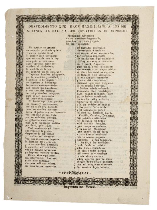 DI - Despedimento que Hace Maximiliano a los Mexicanos al Salir a Ser Juzgado en el Consejo / Adiós a Mamá Carlota. Imprenta de Vélez, ca. 1867. Hoja impresa por ambos lados con dos corridos satíricos, uno referente a Maximiliano y el otro a Carlota. Anverso: "Despedimento que Hace Maximiliano a los Mexicanos al Salir a Ser Juzgado en el Consejo. Mexicanos compasion de un austriaco desgraciado, pues hoy voy á ser juzgado sin tener apelacion. Un clamor en general se escucha por donde quiera y en un cadalso fatal el pueblo pide que muera, que se cumpla con la ley esto pide el mexicano...". Reverso: "Adios a Mamá Carlota. Alegre el marinero Con voz pausada canta, Y el ancla ya levanta Con estraño rumor. Laneave vá en los mares Botando cual pelota, ¡Adios mamá Carlota, Adios mi tierno amor!". Con grabado de navío. No se encuentra listado en Worldcat, no existe historial de venta. Estimado $6,000-8,000