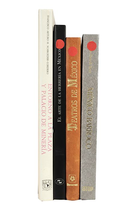 Subasta 710, Lote # 87 A - Castro Morales, Efraín / Tovar de Teresa, Guillermo / Díaz de León Alba, Armando / Schroeder Cordero, Francisco Arturo. El Arte de la Herrería en México / México Barroco / Teatros de México / Entorno a la Plaza y Palacio de Minería. a) Castro Morales, Efraín. El Arte de la Herrería en México. México: Grupo Financiero Bancomer, 1994. fo. marquilla, 228 p. Encuadernado en pasta dura. b) Tovar de Teresa, Guillermo. México Barroco. México: SAHOP, 1981. 4o. marquilla, 331 p. Encuadernado en pasta dura. c) Díaz de León de Alba, Armando. Teatros de México. México: Fomento Cultural Banamex, 1991. 4o. marquilla, 269 p. Puntas gastadas. Encuadernado en pasta dura, en piel. d) Schroeder Cordero, Francisco Arturo. Entorno a la Plaza y Palacio de Minería. México: Universidad Nacional Autónoma de México, 1988. fo. marquilla, XVII + 101 p. Encuadernado en pasta dura. Total de piezas: 4. Estimado $3,000-4,000