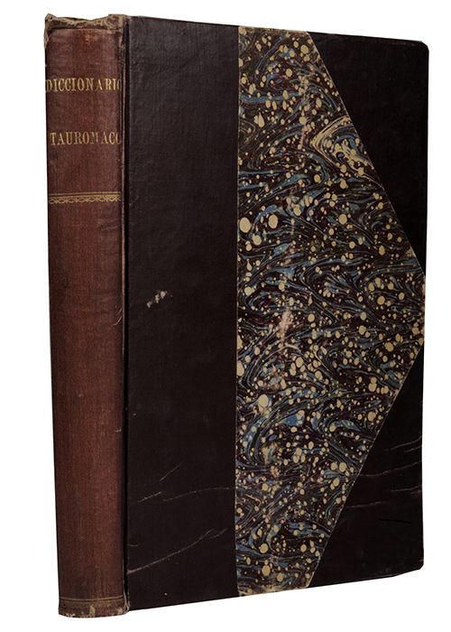 Subasta 710, Lote # 152 CH - Sánchez de Niera, J. Gran Diccionario Tauromaco. Madrid: R. Velasco, 1896. 4o. marquilla, 564 p. Comprende todas las voces técnicas conocidas en el arte, origen, historia, influencia en las costumbres, defensa y utilidad de las corridas de toros, explicación detallada del modo de ejecutar cuantas suertes antiguas y modernas se conocen, lo cual constituye el más extenso Arte de Torear. Hojas de las páginas 59 - 62 por desprenderse. Sin cofia y puntas gastadas. Encuadernado en pasta dura. Estimado $3,000-4,000