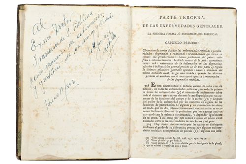 Subasta 710, Lote # 334 ME - Cullen, Guillermo / Brown, Juan / Roche, L. J.- Sanson, L. J. Elementos de Medicina / Nuevos Elementos de Patología Médico - Quirúrgica. a) Cullen, Guillermo. Elementos de Medicina Práctica. Madrid: Imprenta de Benito Cano, 1790. 8o. marquilla, XII + 547 p. Tomo tercero. Picado en margen, no afecta texto. Encuadernado en pergamino. b) Brown, Juan. Elementos de Medicina. Madrid: Imprenta Real, 1800. 8o. marquilla, 186 + CXXIX p. Tomo segundo. Sin cofia, lomo y pastas gastadas. Encuadernado en pasta dura, en piel. c) Roche, L. J.- Sanson, L. J. Nuevos Elementos de Patología Médico - Quirúrgica. Madrid: Imprenta de Verges, 1828. 8o. marquilla, VIII + 479 p. Tomo primero. Lomo y pastas gastadas. Encuadernado en pasta dura, en piel. Total de piezas: 3. Estimado $3,000-4,000