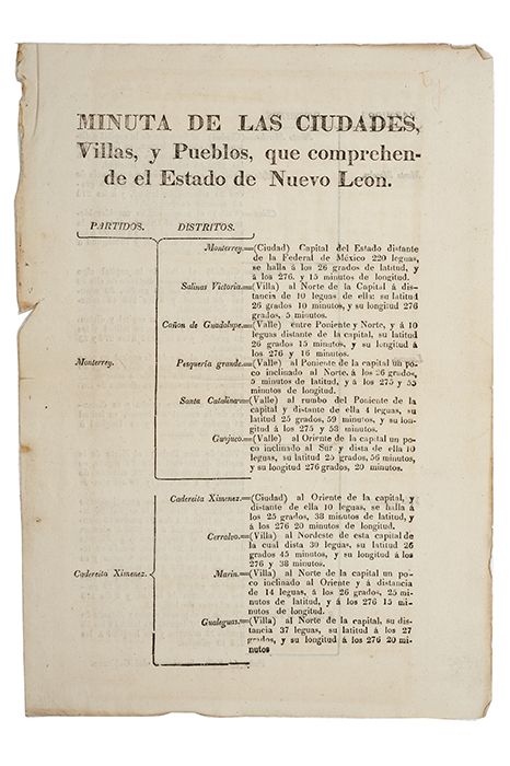 Subasta 710, Lote # 248 G - Valle, Pedro del / González, José Eleuterio. Datos Estadísticos del Estado de Nuevo León ( 1826 y 1873) / Algunos Apuntes. a) Valle, Pedro del. 1. Minuta de las Ciudades, Villas, y Pueblos, que comprehende el Estado de Nuevo Leon. 2. Plan que manifiesta el Censo General del Estado de Nuevo Leon con respecto á su población y clases de habitantes de que se compone. 3. Razón de los nacidos, casados y muertos que ha habido en el Estado de Nuevo Leon. 4. Noticia de los ganados y caballadas que tiene el Estado de Nuevo Leon con esprecion de sus valores. Monterrey Julio 14 de 1826. José María Parás - Pedro del Valle. Piezas: 4. b) González, José Eleuterio. Algunos Apuntes y Datos Estadísticos que Pueden Servir de Base para Formar una Estadística del Estado de Nuevo León. Monterrey, N. L.: Imprenta del Gobierno á cargo de Viviano Flores, 1873. 4o. marquilla, 47 p. Primera parte. Conserva pasta original en rústica. Encuadernado en pasta dura. Total de piezas: 5. Estimado $4,000-5,000