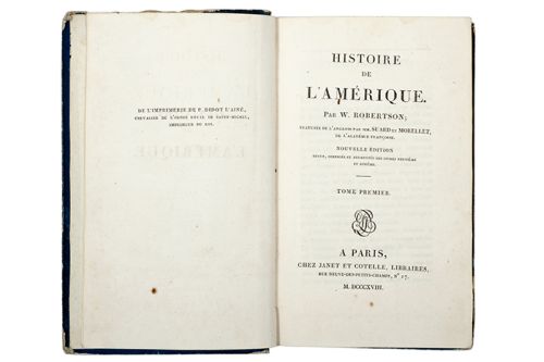 HU - Robertson, William. Histoire de l'Amérique. Paris: Chez Janet et Cotelle 1818. 8o. maquilla, XXXI + 487; 539; 513 p. Traduite de l'anglois par Suard et Morellet. Nouvelle édition revue, corrigée et augmentée des livres neuvième et dixième. Con 4 grandes mapas plegados y una tabla cronológica. Los mapas y la tabla son: "Carte du Golfe du Mexique des Iles et des pays adjacents". "Carte de l'Amérique Méridionale" (Brésil, Pérou, Chili, Argentine, Paraguay, etc.). "Carte du Mexique et de la Nouvelle Espagne". "Carte des pays situés sur la mer du sud depuis Panama jusqu'à Guayaquil". "Table Chronologique des Mexicains". Pastas y lomo gastados. Encuadernados en pasta dura. Piezas: 3. Estimado $4,000-5,000