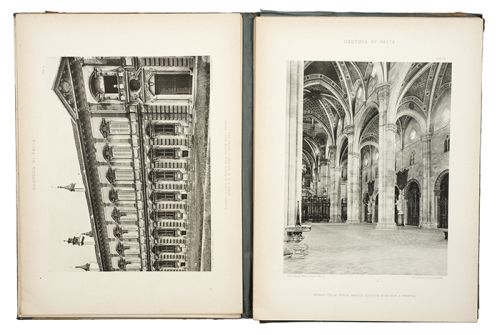 Subasta 710, Lote # 100 A - Jardins d'Italia / Interiors in the Old Italian Tyrol / Portali e Palazzi di Genova / L'Architettura Italiana / La Certosa di Pavia. Carpetas de Arquitectura y Decoración Italiana. a) Gromort, Georges. Jardins d' Italia. Paris: A. Vincent, 1922. Folio marquilla, 36 p. + 148 láminas. Carpeta deteriorada. En carpeta. b) Interiors in the Old Italian Tyrol. Sin pie de imprenta. 4o. marquilla. Sixty plates. En carpeta. c) Grosso, Orlando. Portali e Palazzi di Genova. Milano: Bestetti & Tumminelli. Folio marquilla, 4 h. + Frontispicio + LX láminas (falta lámina V). En carpeta. d) Bianchi, Carlo / Cavallazzi, Antonio (Directores). L'Architettura Italiana. Torino: Crudo & Lattuada, 1905 - 1906. Folio marquilla, 2 h. + 48 p. Año primo, Números 1 - 12. Periódico mensile di Costruzione e di Architettura Pratica. Sin lomo. En carpeta. e) Beltrami, Luca. La Certosa di Pavia. Milano - Parigi: D. Coen & Co. Folio marquilla, 6 p. + 1 h. + 45 láminas. 45 tavole in fototipia. En carpeta. Total de piezas: 5. Estimado $2,000-3,000