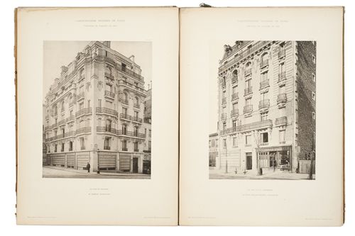 Subasta 710, Lote # 107 A - Librairie Centrale... / L'Architecture Moderne à Paris / Planat, P. L'Architecture et la Décoration Francaises aux XVIIIe et XIXe Siècles / Les Concours de Facades de 1901, 1902, 1903 á 1908 / Détails de Facades. a) Librairie Centrale d´ Art et d'Architecture. L'Architecture et la Décoration Francaises aux XVIIIe et XIXe Siècles. Paris: Maison Morel, Ch. Eggimmann. Folio marquilla doble, 4 h. + 22 p. + 79 láminas (una doble página). Première Série. Sin lomo. En carpeta. b) Librairie Générales de l'Architecture & des Arts Décoratifs. Extérieurs et Intérieurs du XVIIIe Siècle. Paris: Charles Schmid. Folio marquilla, 2 h. + 37 láminas. De l´ Époque Louis XVI a Bordeaux. Lomo roto. En carpeta. c) L'Architecture Moderne à Paris. - Les Concours de Facades de 1901. Émile Thézard, Éditeur. Folio doble, 2 h. + 107 láminas. Librairie Spéciale d'Architecture. Sin lomo. En carpeta. - Concours de Facades de 1902. Émile Thézard, Éditeur. Folio marquilla, 2 h. + 32 láminas. Librairie Spéciale d'Architecture. Sin lomo. En carpeta. - Les Concours de Facades de 1903 à 1908. Émile Thézard, Éditeur. Folio doble, 2 h. + 40 láminas. Librairie Spéciale d'Architecture. Obra repetida. Sin lomos. En carpetas. Piezas: 4. d) Planat, P. Détails de Facades. Paris: Librairie de la Construction Moderne. Folio marquilla, 6 h. + 100 láminas. Choix de motifs d'architecture et de sculpture. En carpeta. Total de piezas: 7. Estimado $3,000-4,000