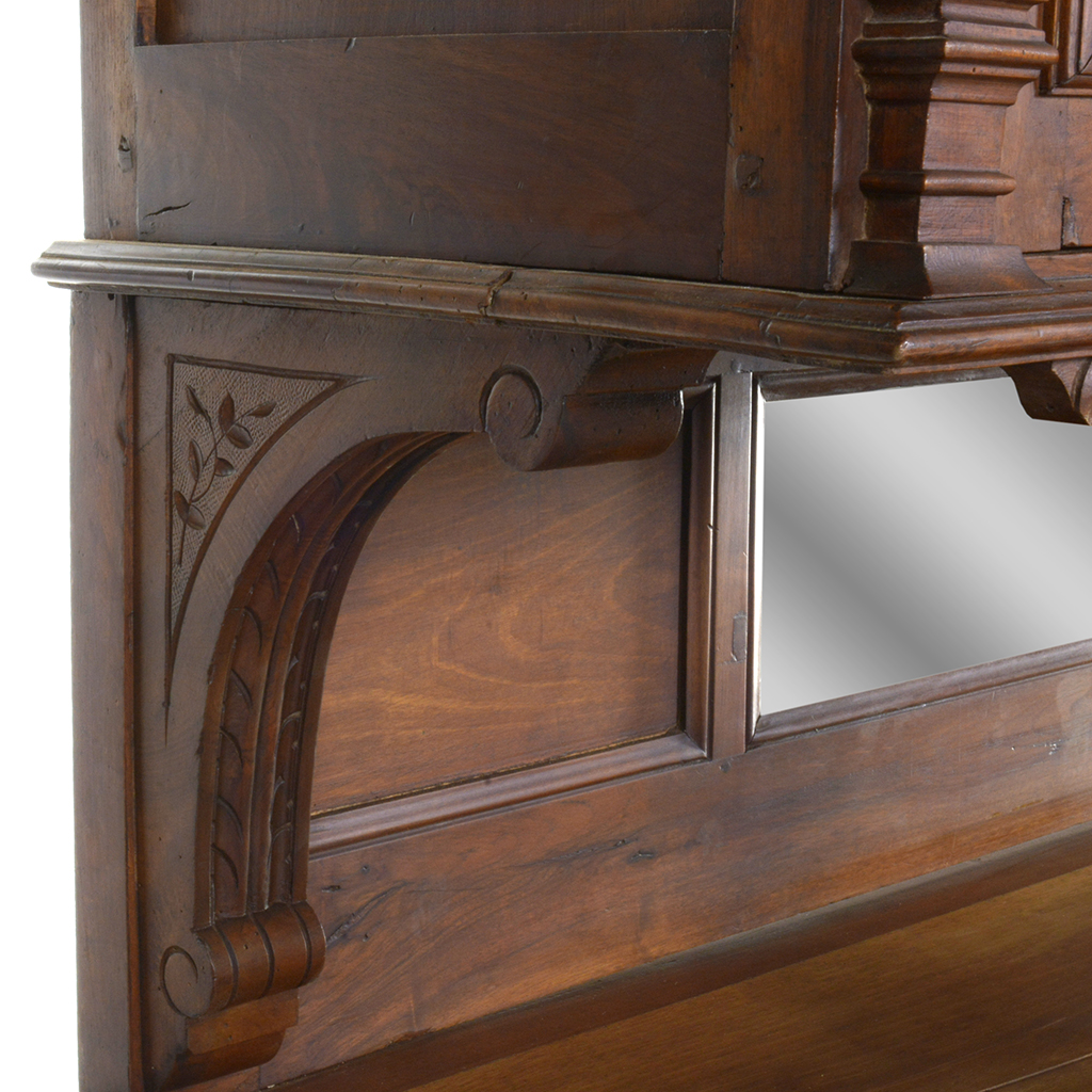 Subasta 929T, Lote # 133 Buffet. Francia. Siglo XX. Estilo Enrique II. Elaborado en madera tallada de nogal. A 2 cuerpos. Con 2 puertas inferiores, 2 cajones centrales, espejo rectangular biselado, 3 puertas superiores y soportes tipo bollo. Decorado con remate superior, acantos, barandillas, rosetones, columnas compuestas, canastas con frutos sostenidas por listones, escena de cacería, bufones, cartelas, acantos y molduras fileteadas. Presenta detalles de conservación, apolillado, fisuras, faltantes, marcas y desgaste. Dimensiones: 244 x 144 x 61 cm. Estimado $ 18,000-20,000
