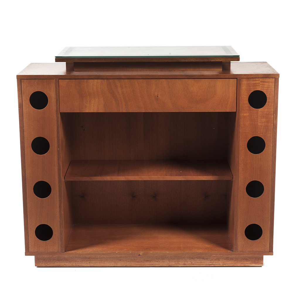 Barra con cubierta de vidrio, cajón posterior, repisa y 6 compartimentos para botellas. Dimensiones: 94 x 110 x 45 cm.