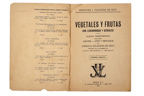 Subasta 710, Lote # 181 CO - Villanueva, Carlota / Velázquez de León, Josefina / Paczka, Alejandro. El Arte en la Cocina / El Tesoro de la Cocina / Selecciones Culinarias / Cocina Vegetariana / Manual de la Consrvación. a) Villanueva, Carlota. El Arte en la Cocina. Morelia: "Tipografía Mercantil", 1932. 8o. marquilla, 116 p. Encuadernado en rústica. b) Velázquez de León, Josefina. El Tesoro de la Cocina. México: Academia Velazquez de León, sin año. 8o. marquilla, 32 p. Colección económica - Ensladas. Primera edición. Encuadernado en rústica. c) Velázquez de León, Josefina. Selecciones Culinarias. México: Ediciones J. Velázquez de León, 1946. 8o. marquilla, 138 p. Primera edición. Encuadernado en rústica. d) Velázquez de León, Josefina. Cocina Vegetariana y Semi -Vegetariana. México: Ediciones J. Velázquez de León, 1946. 8o. marquilla, 464 p. Falta tapa posterior y la anterior esta deteriorada, lomo falto de tercio inferior. Primera edición. Encuadernado en rústica. e) Paczka, Alejandro. Manual de la Conservación Práctico de Productos Alimenticios. México: 1934. Ilustrado. Primera edición. Encuadernado en rústica. Total de piezas: 5. Estimado $4,000-5,000