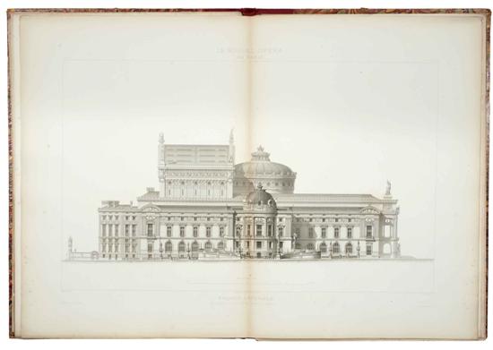 A - Garnier, Charles M. Le Nouvel Opera de Paris. París: Libraire Génerale de l'Architecture et des Travaux Publics Ducher et Cie., 1880. Folio doble marquilla. Tomo I: con 35 láminas (5 doble página). Tomo II: con 40 láminas (20 cromolitografías). En carpeta. Piezas: 2. Estimado $8,000-12,000