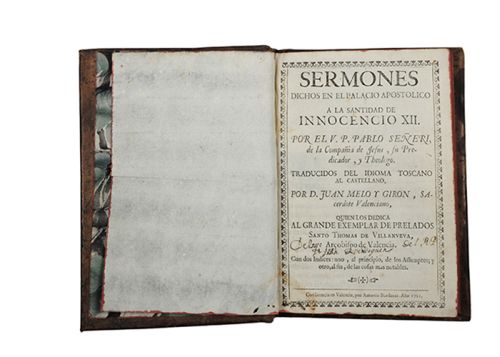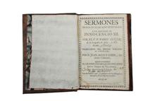 Subasta 710, Lote # 358 R - Señeri, Pablo / Zuazo, Alexandro. Sermones a la Santidad de Inocencio XII / Ceremonial Según las Reglas del Missal Romano. a) Señeri, Pablo. Sermones dichos en el palacio apostólico a la Santidad de Inocencio XII. Valencia: Antonio Bordazar, 1721. 8o. marquilla, 7 h. + 315 p. Picado en margen inferior. Lomo y pastas gastadas. Encuadernado en pasta dura, en piel. b) Zuazo, Alexandro. Ceremonial Según las Reglas del Missal Romano. Salamanca: Imprenta de la Ilustre Cofradia de la Santa Cruz, 1753. 4o. marquilla, 11 h. + 457 p. + 12 p. Ilustrado con doctrinas de los authores mas classicos, antiguos y modernos. Pastas gastadas. Encuadernado en pasta dura, lomo en piel. Total de piezas: 2. Estimado $4,000-5,000