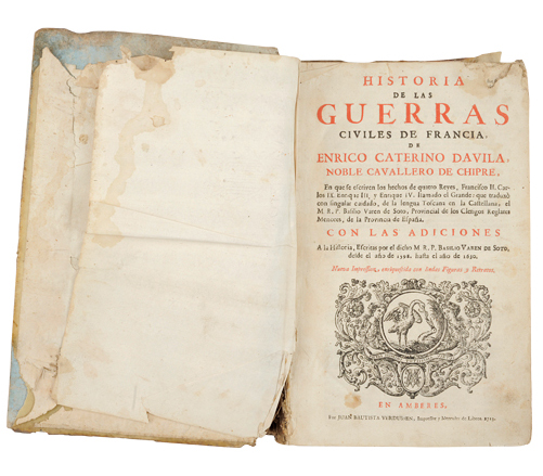 Subasta 710, Lote # 290 HU - Dávila, Enrico Caterino. Historia de las Guerras Civiles de Francia. Amberes: Juan Bautista Verdussen, 1713. Folio, 2 h. + 555 p. + 6 h. + 170 p. Con 24 láminas, grabados en cobre (retratos). En que se escriven los hechos de quatro Reyes, Francisco II, Carlos IX, Enrique III y Enrique IV llamado el Grande. Traducción y adiciones por Basilio Varen de Soto. Sin cofia, sin pie, pastas con faltantes. Lomo y pastas por desprenderse. Encuadernado en pergamino. Estimado $6,000-8,000