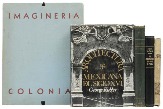 Subasta 710, Lote # 83 A - Baxter, Silvestre / Ibañez G., Rafael / Kubler, George / Toussaint Manuel / Secretaría de Educación Pública. La Arquitectura / La Arquitectura Colonial en Puebla / Arquitectura Mexicana del Siglo XVI / Imaginería Colonial / Tres Siglos de Arquitectura Colonial. a) Baxter, Silvestre. La Arquitectura Hispano Colonial en México. México, 1934. 4o. marquilla, XXVII + 219 p.+ láminas. Introducción y Notas de Manuel Toussaint. Sin refinar. Puntas y lomo gastados. Encuadernado en pasta dura, lomo y piel. b) Ibañez G., Rafael. La Arquitectura Colonial en Puebla. Puebla: Talleres de la Revista "Mignon", 1949. 4o. marquilla, 2 h. + 270 p. Conserva pastas originales en rústica, pasta anterior desprendida. Con dedicatoria del autor. Portada con el título subrayado con lápiz. Encuadernado en pasta dura. c) Kubler, George. Arquitectura Mexicana del Siglo XVI. México: Fondo De Cultura Económica, 1983. 4o. marquilla, 683 p. Primera edición en español. Profusamente ilustrado. Encuadernado en pasta dura. d) Toussaint, Manuel. Imaginería Colonial. México: Universidad Nacional Autónoma de México, 1941. fo. marquilla, + 26 láminas. Falta una lámina, la número 27. Textos de Manuel Toussaint y Rodríguez Lozano. Pastas sucias. En carpeta. e) Secretaría de Educación Pública. Tres Siglos de Arquitectura Colonial. México: Talleres Gráficos de la Nación, 1933. 4o., XV + 150 p. + 4 h. Texto ilustrado con fotografías del Ing. Benítez, Arq. Mac Gregor, M. Toussaint, M. Ramos, F. Kahlo y H. Brehme. Faltante en lomo, pastas y puntas deteriorados. Encuadernado en pasta dura. Total de piezas: 5. Estimado $8,000-10,000