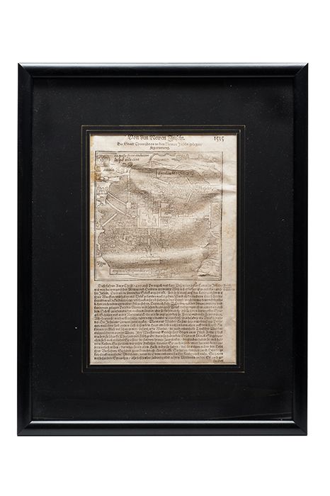 G - Munster, Sebastian. Der Statt Themistitan in den Newen Inseln Gelegen. Alemania, 1597. Plano grabado de la ciudad de Tenochtitlan. 29 x 18.5 cm. Manchas de óxido. Enmarcado. Estimado $8,000-10,000