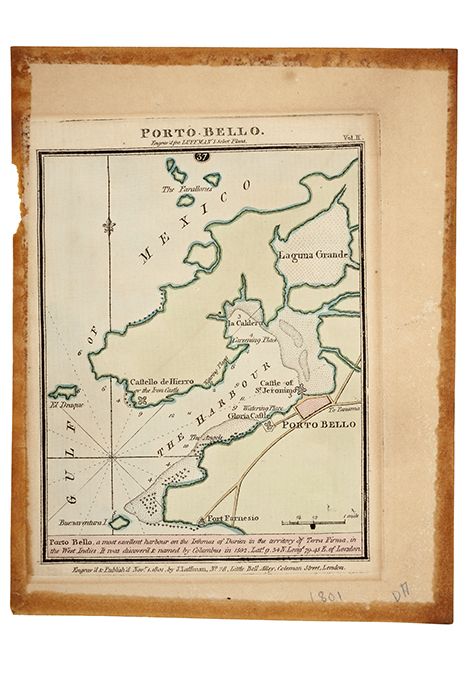 G - Luffman, John. Porto Bello. Engraved for Luffman's Select Plans. London: 1801. Mapa grabado coloreado, 17 x 13.5 cm. Con la leyenda debajo "Porto Bello, a most excellent harbour on the Isthmus of Darien in the territory of Terra Firma, in the West Indies. It was discoverd (sic) and named by Columbus in 1502". Manchas de humedad. Estimado $3,000-4,000