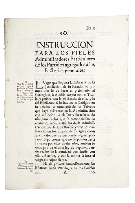 Subasta 710, Lote # 53 DI - Hierro, Phelipe del. Instrucción para los Fieles Administradores Particulares de los Partidos Agregados á las Factorias Generales. "Luego que llegue á la Cabezera de la Jurisdiccion de su Partido, lo primero que ha de hacer es presentarse al Corregidor, ó Alcalde mayor con el Titulo, y passará con la assistencia de este, y la del Escribano, si lo huviere, ó Testigos en su defecto, á entregarse de los Tabacos que haya existentes en la Administracion que se le destinasse, como los que huviesse en los Lugares de su agregacion; y en caso que se encuentre alguna porcion, ó porciones, que no se puedan dar á la venta por estar adulterados, tambien se entregará de ellos á ley de deposito, dando recibo de la cantidad que fuesse con esta distincion, y con la misma se hará el cargo correspondiente...". México á 2 de Mayo de 1768. Firma. Puntos y surcos de polilla al margen, manchas de humedad. Estimado $4,000-5,000