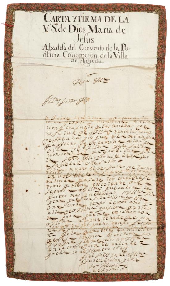 Subasta 710, Lote # 69 DM - Coronel y Arana, María (La Venerable María de Jesús de Ágreda). Carta y Firma de la Venerable Sierva de Dios Maria de Jesus. Abadesa del Convento de la Purissima Concepcion de la Villa de Agreda. "Ilustrísimo Señor Mío. ...con mucha estimacion y consuelo y las nuebas de la salud de vuestra Ilustrísima tenía las muy desseadas por que toda mi anssia y affecto se encamina a larga vida de vuestra Ilustrisima y a su salbacion como la mayor dicha pidala señor Mio por mi y deba yo a su piedad este fabor. Estimo mucho es despacho de las nobicias que es tiempo [faltante] en libertad nuestra Josepha esta linda ya sabe ler en el Refetorio y tiene excelente voz[,] aseguro a vuestra Ilustrisima que cada dia la quiero mas[,] puede estar vuestra Ilustrisima sin pena que consoladissima esta[,] una carta tengo de nuevo amo que abla de vuestra Ilustrisima[,], quisiera ynbiarla para que me encaminara vuestra Ilustrisima a lo que le he de responder no ba por que no tengo persona [faltante] que esta alla pena yo la remitire en biniendo y en esa ocassion escribira Sor Josepha que de medios a vuestra Ilustrisima en la concepcion descalza de agreda lo de Henero 1658. Fiel sierba de vuestra Ilustrisima que su bendicion pide.". Sor Maria de Jesús. Dobleces marcados, presenta pequeños faltantes. Documento sobre tela, con marco bordado en hilo plateado. María de Jesús de Ágreda, es indiscutiblemente la figura espiritual más interesante de la España del siglo XVII. Es el gran exponente de la espiritualidad del barroco, entonces en todo su furor. Sus valores humanos fueron extraordinarios. De ascendencia judía por vía paterna, fue de voluntad generosa, inteligente, imaginación creadora, gran capacidad de asimilación y facilidad para escribir. Su virtud ha sido reconocida por todos: oración intensa, penitencias, pobreza, caridad y celo apasionado por los demás. Los fenómenos externos (por ejemplo, éxtasis) la hicieron pronto célebre. Su supuesto don de la bilocación (término utilizado para describir un fenómeno paranormal, sobrenatural o divino en el cual una persona u objeto estaría ubicado en dos lugares diferentes simultáneamente) descrito por franciscanos e indígenas en Nuevo México, la hizo comparecer ante la Inquisición en un proceso que duró dos años y que se se llevó a cabo en los años 1649 y 1650, no obstante salió victoriosa de este episodio. En 1673 se inició su proceso de beatificación, llegando a ser declarada "venerable" por Clemente X. Estimado $8,000-10,000