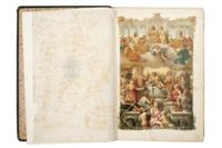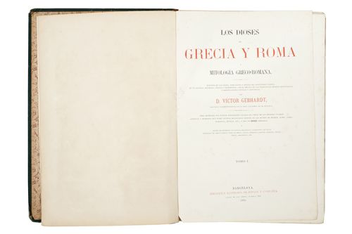 Subasta 710, Lote # 292 HU - Gebhardt, Víctor. Los Dioses de Grecia y Roma. Barcelona: Biblioteca Ilustrada de Espasa y Compañía, 1880 y 1881. Folio marquilla, 712; 895 p. Historia de los dioses, semi - dioses y héroes del gentilismo clásico, de sus dogmas, misterios, fiestas y ceremonias, con el relato de las tradiciones heroico - mitológicas, y observaciones críticas y artísticas. Obra adornada con lujosas oleografías sacadas de copias de los mejores cuadros antiguos y modernos... Tomo I: con 47 láminas y páginas 27 - 30 por desprenderse. Sin cofia, sin pie y lomo y puntas gastadas. Tomo II: con 19 láminas, cajos quebrados, sin cofia, sin pie y lomo gastado. Encuadernados en pasta dura, lomo en piel. Piezas: 2. Estimado $4,000-5,000