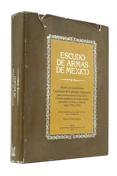 Subasta 710, Lote # 258 HM - Cabrera y Quintero, Cayetano. Escudo de Armas de México. México: Instituto Mexicano del Seguro Social, 1981. fo. marquilla, XCVIII + facsímil. Celestial Protección de Esta Nobilissima Ciudad, de la Nueva España, y de Casi Todo el Nuevo Mundo, María Santíssima, en su Portentosa Imagen del Mexicano Guadalupe, Milagrosamente Aparecida en el Palacio Arzobispal el Año de 1531 y Jurada su Principal Patrona el Passado de 1737. En la angustia que ocasiono la Pestilencia, que cebada con mayor rigor en los Indios, mitigó sus ardores al abrigo de tanta sombra. Encuadernado en pasta dura. Estimado $4,000-5,000