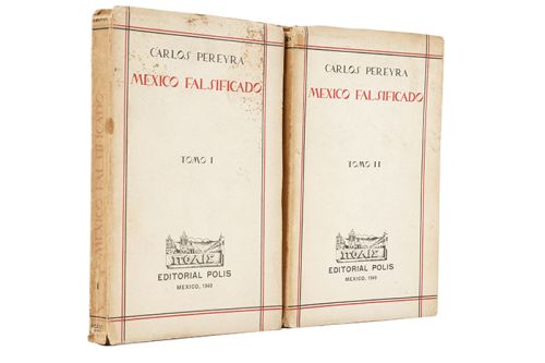 LA - Pereyra, Carlos. México Falsificado. México: Editorial Polis, 1949. 8o. marquilla, 300; 410 p. Tomos I y II. Sin cofias, sin pies, y lomos y pastas desprendidas. Encuadernados en rústica. Piezas: 2. Estimado $3,000-4,000