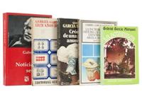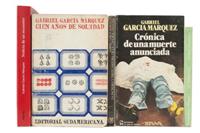Subasta 710, Lote # 319 LA - García Márquez, Gabriel. Cien Años de Soledad / La Hojarasca / Crónica de una Muerte Anunciada / La Increíble y Triste Historia de la Cándida Eréndira y de su Abuela Desalmada / Noticia de un Secuestro. a) Cien Años de Soledad. Buenos Aires: Editorial Sudamericana, 1975. 8o. marquilla, 359 p. Portada de Vicente Rojo. Cajo anterior quebrado en parte inferior. Encuadernado en rústica. b) La Hojarasca. Buenos Aires: Editorial Sudamericana, 1978. 8o. marquilla, 183 p. Encuadernado en rústica. c) Crónica de una Muerte Anunciada. Colombia: Editorial la Oveja Negra, 1981. 8o. marquilla, 156 p. Primera edición. Lomo y pastas por desprenderse. Encuadernado en rústica. d) La Increíble y Triste Historia de la Cándida Eréndira y de su Abuela Desalmada. México: Editorial Hermes, 1972. 8o. marquilla, 163 p. Primera edición. Encuadernado en rústica. e) Noticia de un Secuestro. México: Editorial Diana, 1996. 8o. marquilla, 346 p. Primera edición. Encuadernado en rústica. Total de piezas: 5. Estimado $4,000-5,000