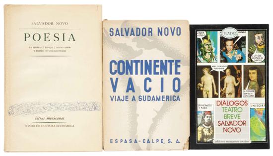 LA - Novo, Salvador. Continente Vacío / Poesía / Diálogos Teatro Breve. a) Continente Vacío. Viaje a Sudamérica. Madrid: Espasa - Calpe, 1935. 8o. marquilla, 259 p. Intonso. Encuadernado en rústica. b) Poesía. México: Fondo de Cultura Económica, 1977. 8o. marquilla, 187 p. Letras mexicanas. XX Poemas / Espejo / Nuevo Amor y Poesías No Coleccionadas. Encuadernado en pasta dura. c) Diálogos Teatro Breve. México: Editores Mexicanos Unidos, 1985. 8o. marquilla, 190 p. Primera edición. Encuadernado en rústica. Total de piezas: 3. Estimado $6,000-8,000