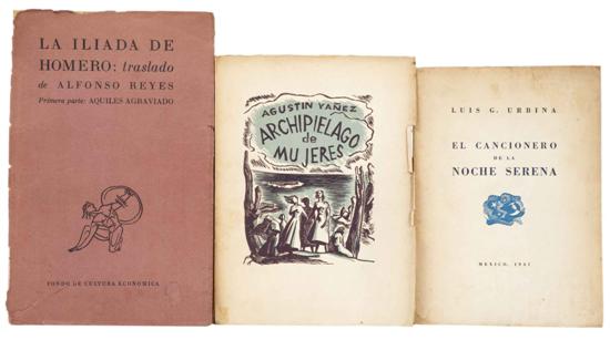Subasta 710, Lote # 327 LA - Reyes, Alfonso (Traslado) / Urbina, Luis G. / Yañez, Agustín. La Iliada de Homero / El Cancionero de la Noche Serena / Archipiélago de Mujeres. a) Reyes, Alfonso (Traslado). La Iliada de Homero. Fondo de Cultura Económica, 1951. 4o. marquilla, 243 p. Primera Parte: Aquiles Agraviado. Ilustraciones de Elvira Gascón. Primera edición. Con 10 láminas a color. Sin refinar. Lomo deteriorado, algunas páginas y pastas desprendidas. Encuadernado en rústica. b) Urbina, Luis G. El Cancionero de la Noche Serena. México: 1941. 4o. 124 p. Julio Prieto grabó en madera el retrato de Urbina y las viñetas. Edición de doscientos cincuenta ejemplares numerados del 1 al 250, ejemplar sin numerar. Intonso. Encuadernado en rústica. c) Yañez, Agustín. Archipiélago de Mujeres. México: UNAM, 1943. 4o. marquilla, XXIV + 212 p. Ilustrado por Julio Prieto con once grabados en madera. Intonso. Dedicado al Sr. Ricardo Garibay por el autor. Encuadernado en rústica. Total de piezas: 3. Estimado $6,000-8,000