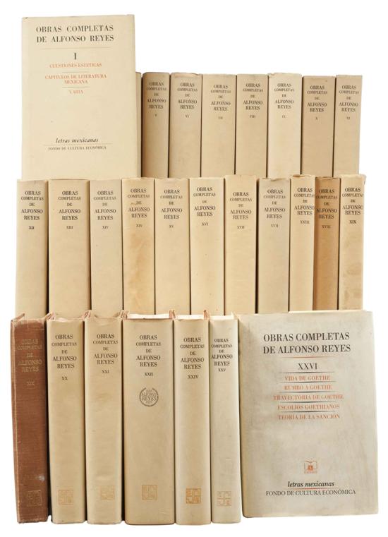LA - Reyes, Alfonso. Obras Completas. México: Fondo de Cultura Económica, 1956 - 1993. 8o. marquilla, 369; 373; 519; 622; 397; 455; 529; 487; 527; 512; 415; 433; 587; 413; 413; 525; 614; 571; 571; 451; 451; 441; 441; 541; 501; 894; 622; 516; 511 p. Letras Mexicanas. Números I al XXII y XXIV al XXVI. Números I y II: primeras reimpresiones. Números III al XXVI primeras ediciones. Número XIV: repetido. Número XVII: repetido, primera edición y primera reimpresión. Número XVIII: repetido, primera edición y primera reimpresión. Número XIX: repetido, primera edición (sin cubierta) y primera reimpresión. Encuadernados en pasta dura. Piezas: 29. Estimado $10,000-12,000