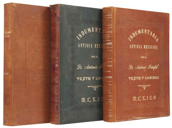 Subasta 710, Lote # 315 LA - Dupaix, Guillermo / Peñafiel, Antonio. Atlas de las Antigüedades Mexicanas / Indumentaria Antigua Mexicana. a) Dupaix, Guillermo. Atlas de las Antigüedades Mexicanas. México: San Ángel Ediciones, 1978. fo. doble, 405 p. + Apéndices. Halladas en el curso de los tres viajes de la Real Expedición de Antigüedades de la Nueva España, emprendidos en 1805, 1806 y 1807. Contiene la reproducción facsimilar de las litografías ejecutadas a partir de los dibujos de José Luciano Castañeda e impresas en París, en 1834, por Jules Didot. Prefacio de Miguel León Portilla. Edición de 2,000 ejemplares. Encuadernado en pasta dura, en piel. b) Peñafiel, Antonio. Indumentaria Antigua Mexicana. México: Oficina Tipográfica de la Secretaria de Fomento. 1903. Folio doble, 186 p. + 198 láminas a color. Edición de 2,000 ejemplares. Obra repetida. Encuadernado en pasta dura, en piel. Encuadernado en pasta dura, lomo en piel. Con cajo interior quebrado. Piezas: 2. Total de piezas: 3. Estimado $8,000-10,000