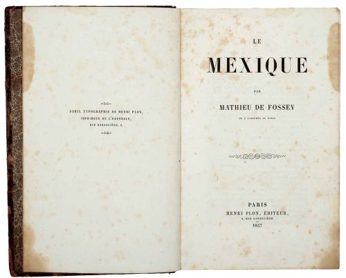 HM - Fossey, Mathieu de. Le Mexique. Paris: Henri Plon, Editeur, 1857. 4o., VIII + 581 p. Con dedicatoria y firma del autor. En francés. Manchas de óxido y humedad, lomo roto, sin pie. Encuadernado en pasta dura, lomo en piel.