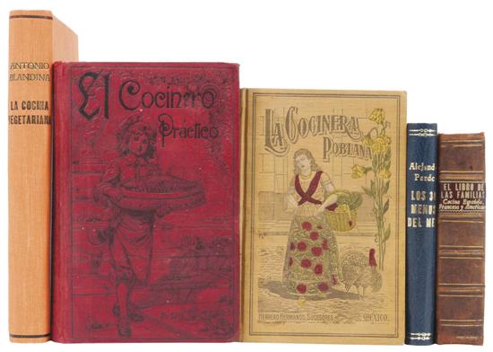 Subasta 710, Lote # 165 CO - Mandina, Antonio / Pardo, Alejandro / Herrero Hermanos Sucesores / Calleja, Saturnino / López, Leocadio. La Cocinera Vegetariana / Los 30 Menús del Mes / La Cocinera Poblana / El Cocinero Práctico / El Libro de las Familias. a) Mandina, Antonio. La Cocinera Vegetariana. México: Talleres de la Casa Eduardo Murguía, sin año. 4o. marquilla, XVI + 200 p. Sin refinar. Encuadernado en pasta dura. b) Pardo, Alejandro. Los 30 Menús del Mes. México: Talleres Tipográficos, 1917. 8o. marquilla, 242 p. Pasta original con faltantes. Encuadernado en pasta dura, lomo en piel. c) Herrero Hermanos Sucesores. La Cocinera Poblana. México: Herrero Hermanos Sucesores, 1921. 8o. marquilla, 432 p. Pastas gastadas. Encuadernado en pasta dura. d) Calleja, Saturnino. El Cocinero Práctico.Nuevo Tratado de Cocina. Repostería y Pastelería. Madrid: Saturnino Calleja Fernández, sin año. 8o. marquilla, LV + 700 p. Lomo y pastas gastados. Encuadernado en pasta dura, lomo en piel. e) López, Leocadio. El Libro de las Familias. Madrid: Librería de D. Leocadio López, Editor, 1873. 8o., VII + 733 p. Manchas de óxido, pastas gastadas. Encuadernado en pasta dura, lomo en piel. Total de piezas: 5. Estimado $8,000-10,000
