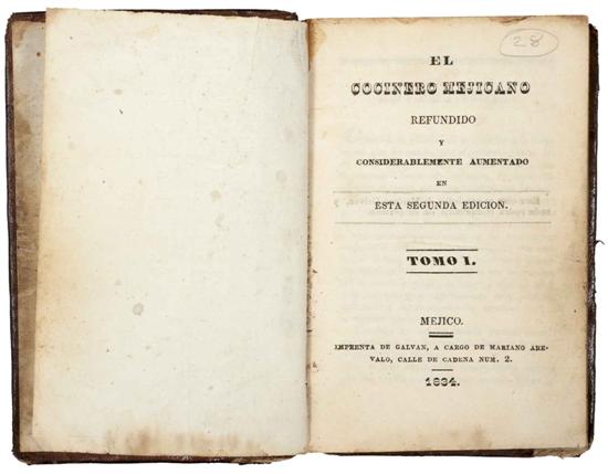 CO - El Cocinero Mejicano. Refundido y Considerablemente Aumentado. Méjico: Imprenta de Galván, a cargo de Mariano Arévalo, 1834. 16o. marquilla, 414 p. + 11 h.; 362 p. + 2 h. Segunda Edición. Tomo I - Cofia y pie rotos, sin puntas, pastas gastadas. Tomo II - Pasta anterior por desprenderse, manchas de humedad y óxido. Piezas: 2. Estimado $8,000-10,000