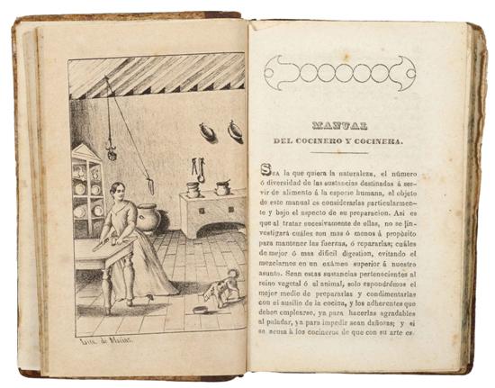 CO - Ayguals de Izco, Wenceslao (Prólogo). Manual del Cocinero y Cocinera tomado del Periódico Literario " La Risa". Puebla : Imprenta de José María Macías, 1849. 8o. marquilla, 397 p. + 8 h. Con ocho láminas. Portada y frontispicio son copias. Lomo y pastas gastados, manchas de humedad y óxido. Encuadernado en pasta dura, lomo en piel. Estimado $8,000-10,000