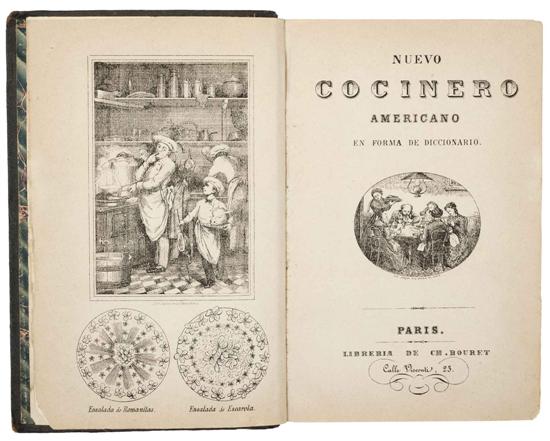 CO - Nuevo Cocinero Americano. En Forma de Diccionario. París: Librería de Bouret é Hijo, 1878. 4o. marquilla, frontispicio + 2 h. + 966 p. + VI láminas. Con sellos del Lic. Francisco de P. Olvera. Texto amarronado, faltantes al margen, lomo gastado. Encuadernado en pasta dura, lomo en piel. Estimado $8,000-10,000