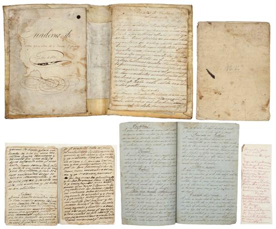 Subasta 710, Lote # 179 CO - Varios Autores. Recetas de Cocina. Manuscritos. a) Espinoza, Vicente. Cuaderno de Resetas para el Uso. Año de 1836. 8o. marquilla, 8 h. Manchas severas de humedad y óxido. b) Martínez de Garibay, Jesús. Arte de Cocina para Uso. Morelia, mayo 22. 8o. marquilla, 5 h. Faltantes en primera y última página, manchas severas de humedad y óxido. c) Resetas de Cosina el Colorado. Siglo XIX. 8o. marquilla, 26 h. Severas manchas de humedad y óxido. d) Recetario. Siglo XIX. 8o. marquilla, 20 h. Severas manchas de humedad, faltantes en última página, afecta texto. e) Recetario. Siglo XIX. 8o. marqulla, hojas sueltas. Sevras manchas de humedad y óxido. Todos los manuscritos en cubierta de pergamino. Total de piezas: 5. Estimado $8,000-10,000