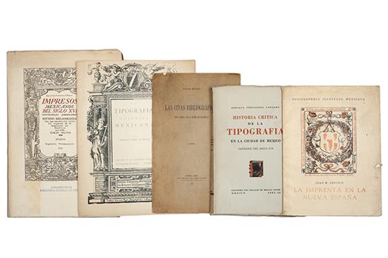 Subasta 710, Lote # 130 B - Iguiniz, Juan B. / Valton, Emilio / Fernández Ledesma, Enrique / Gómez de Orozco, Federico / Binayán, Naciso. La Imprenta en la Nueva España / Impresos Mexicanos del S. XVI / Historia Critica de la Tipografía / La Tipografía Colonial / Las Citas Bibliograficas. a) Iguiniz, Juan B. La Imprenta en la Nueva España. México: Porrúa Hnos., 1938. 4o. marquilla, 61 p. Con Ex-Libris de Rodolfo Foquero. Profusamente ilustrada. Pequeño faltante en pasta anterior, pastas gastadas. Encuadernado en rústica. b) Valton, Emilio. Impresos Mexicanos del Siglo XVI. Incunables Americanos. Estudio Bibliográfico. Con una introducción sobre los orígenes de la imprenta en América. México: Imprenta Vniversitaria, 1935. 4o. marquilla, XXXI + 244 p. Con Ex-Libris de Rodolfo Foquero y sello en la pasta anterior con la leyenda "Donación de la Biblioteca Nacional de México". Sin refinar. Pasta anterior por desprenderse, pastas muy gastadas. Encuadernado en rústica. c) Fernández Ledesma, Enrique. Historia Crítica de la Tipografía en la ciudad de México. Impresos del Siglo XIX. México: Ediciones del Palacio de Bellas Artes, 1934-1935. 4o. marquilla, 185 p. Profusamente ilustrado. Pastas sucias y deterioradas. Encuadernado en rústica. d) Gómez de Orozco, Federico. La Tipografía Colonial Mexicana. México: Ediciones de la Universidad Nacional, sin año. Ilustrado. Manchas de óxido. Encuadernado en rústica. e) Binayán, Narciso. Las Citas Bibliográficas. Nota Acerca de la Forma de Hacerlas. Buenos Aires: Jesús Menéndez e Hijo, 1923. 4o. marquilla, 16 p. Manchas de humedad. Encuadernado en rústica. Total de piezas: 5. Estimado $4,000-5,000