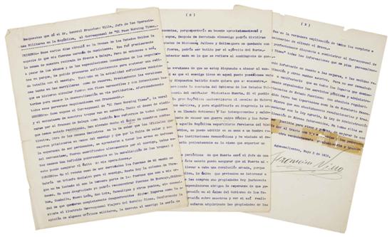 Subasta 710, Lote # 75 DM - Villa, Francisco. Respuestas que da el Sr. General Francisco Villa, Jefe de las Operaciones Militares en la República, al Corresponsal de "El Paso Morning Times". "PRIMERO:- Hace varios días circuló en la Prensa de los Estados Unidos la especie de que mis fuerzas carecen de municiones. Esa fue precisamente la causa de nuestra retirada de frente a Celaya. Pero de entonces a acá, a pesar de los abusos y de las especulaciones inmoderadas de los negociantes en parque, he podido proveerme suficientemente para sostener una reñida batalla con el enemigo… TERCERO:- En el remoto caso de ser derrotadas las fuerzas de mi mando no habría un triunfo decisivo para el enemigo. Hasta hoy la columna de Obregón no ha luchado ni con la tercera parte de las fuerzas que son mis ordenes… SEXTO:- Considero inconveniente la conducta del Gobierno de los Estados Unidos al consentir la presencia del ex dictador Victoriano Huerta. Sí el pueblo y e Gobierno de aquella gran República anatematizaron al asesino de Madero, Pino Suárez y otros muchos mártires… el pueblo de aquella República es partidario ferviente del bienestar y libertad de los pueblos, no puede admitir en su seno a un hombre repugnante que ha pisoteado las instituciones democráticas y ha violado el derecho internacional… Mucho han hablado los periódicos de que Huerta será el Jefe de una nueva revolución: pero sobre este asunto puedo asegurar que ni Huerta ni los científicos son capaces de llevar a cabo una revolución armada, porque no cuentan con la opinión pública. Lo único que pretenden es interesar a los judíos extranjeros para que les compren sus propiedades hoy justamente decomisadas… Mucho puedo informarle en cuanto a las mejoras, a las medidas relativas a la organización y otros muchos asuntos… que los Departamentos de Estado funcionan con absoluta regularidad, que se han expedido leyes tan importantes como la de Moratoria Bancaria y la de Caducidad Minera que son absolutamente revolucionarias…". Aguascalientes, Mayo 5 de 1915. Firma. Tres cuartillas mecanomanuscritas; la última reforzada con diurex en doblez. "El Paso Morning Times". Este periódico detallaba en español y en .inglés el progreso de la Revolución Mexicana pues tenía numerosos lectores en la frontera mexicana, principalmente chihuahuenses; sin embargo en varias ocasiones Francisco Villa desacreditó la información publicada por este periódico y lo hacía notar a través de respuestas que publicaba en otros periódicos locales como "Vida Nueva", sin embargo es difícil conocer el alcance que tendrían en primer lugar las notas periodísticas de "El Paso..." asi como las respuestas enviadas por el caudillo a través de telegramas y difundidas en una población mayoritariamente analfabeta. Estimado $25,000-30,000