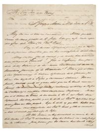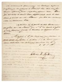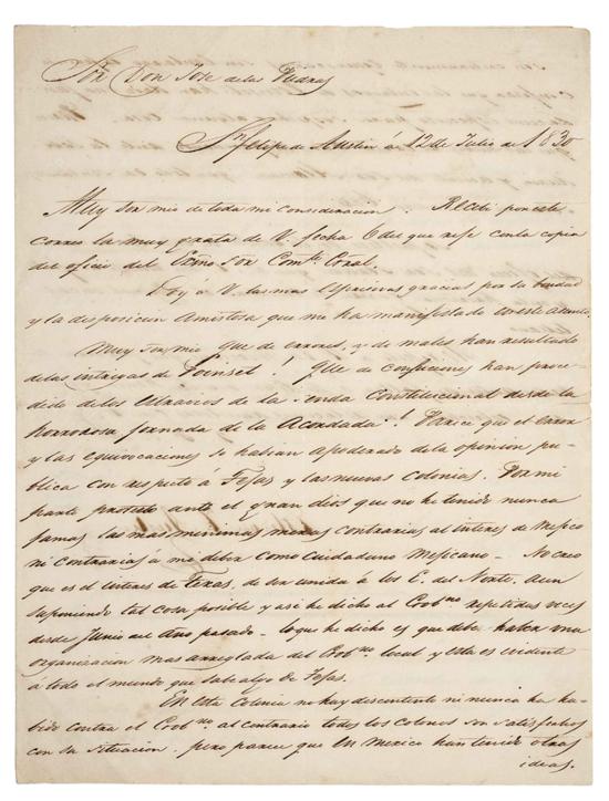 Subasta 710, Lote # 67 DM - Austin, Estevan F. Carta dirigida al Sr. Don José de las Piedras. San Felipe Austin á 12 de Julio de 1830. "Muy Sor. mío de toda mi consideración. Recibí por este correo la muy grata de V. fecha 6 del que rije con la copia del oficio del Exmo. Sor. Comte. Gral. Doy á V. las mas espresivas gracias por la bondad y la disposición amistosa que me ha manifestado en este asunto. Muy sor. mío que de errores y de males han resultado de las intrigas de Poinset ! que de confirmarse han procedido de los estravios de la senda Constitucional desde la horrorosa jornada de la Acordada. Parece que el error y las equivocaciones se habían apoderado de la opinión pública con respecto á Tejas y las nuevas Colonias. Por mi parte protesto ante el gran Dios que no he tenido nunca jamás las mas mínimas miras contrarias al interés de Méjico ni contrarias á mi deber como ciudadano Mejicano. No creo que es el interés de Tejas de ser unida á los E. del Norte. Aun suponiendo tal cosa posible y así he dicho al Gobno. Repetidas veces desde Junio del año pasado, lo que he dicho es que debe haber una organización mas arreglada del Gobno. local y esta es evidente á todo el mundo que sabe algo de Tejas. En esta Colonia no hay descontento ni nunca ha habido contra el Gobno. al contrario todos los colonos son satisfechos con la situación, pero parece que en México han tenido otras ideas, son enteramente equivocadas sin embargo es preciso confesar que las intrigas de Poinset han dado una fundación especiosa para sospechar alguna cosa. Parece que las nubes de error van desapareciendo ante la sabiduría y acierto del Sor. Alamán que todo va sentándose sobre su verdadera base. Se publicó en la gaceta de esta traducción del oficio del Sor. Teran que S. E. me remitió al efecto y en la próxima gaceta se incertara el original en castellano. Me repito á V. un mexicano que perderá su vida antes de faltar á sus deberes ó á su honor y que desea estrechar sus relaciones amistosas con V. Q. B. S. M. Estevan F Austin. Austin, Esteban Fuller (1793 - 1836). Colonizador y separatista de Texas. Hizo tres descripciones del territorio texano; la primera la publicó en el Galveston News, en 1828; la segunda es de 1831 y tuvo por objeto atraer colonos; la tercera, de 1833, falsea los datos, para obtener la separación de Texas del Edo. de Coahuila, primer paso para la separación total. En 1822 estuvo en México, haciendo gestiones para colonizar Texas. Sí por una parte hacia manifestaciones de adhesión a México por la otra fomentaba el separatismo: escribió al Ayuntamiento de S. Antonio aconsejándole formar en Texas un gobierno independiente del de Coahuila, para luego separarse de México. El Ayuntamiento indignado da parte al gobierno mexicano. En enero de 1835 publica su Exposición al publico sobre los asuntos de Texas, en la que manifiesta que "los habitantes de Texas están quietos, dedicados al cultivo de las tierras… a los goces de la vida doméstica, sin pensar en pronunciamientos, trastornos políticos ni revoluciones". El 11 de octubre de ese año es nombrado jefe del ejército, con el que avanza sobre Béjar. Poco después se proclamó la "República de Texas". Diccionario Porrúa de Historia, Biografía y Geografía de México. México, 1964. Estimado $100,000-120,000