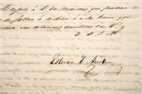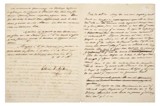 DM - Austin, Estevan F. Carta dirigida al Sr. Don José de las Piedras. San Felipe Austin 12 de Junio de 1830. "Muy Sor. mío, no recibí la carta de V. fecha 31 de Marzo po. po. Hasta después de mi vuelta de Bexar el 9 del presente. He estado aucente de esta lo mas del tiempo desde el mes de Febo. solamente regresando a mi casa dos veces, y por pocos días cada vez. Hago mension de esto, para imponerse de la razón porque no contesté antes de ahora, a la citada apreciable de V. Hasta ahora no he tenido noticias ningunas de la Goleta nacional Constante, de que V. me habla en su carta. El Administrador de Galveston ha entrado en el desempeño de su destino, y no perderé tiempo en avisarle de los deseos de V. para que tengan su debido efecto. Con todo respeto quedo el muy atento amigo y servidor de V. Q. S. M. B. Estevan F. Austin.