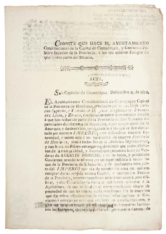Subasta 710, Lote # 205 EA - OBRA RARÍSIMA Y DE GRAN IMPORTANCIA HISTÓRICA Y BIBLIOGRÁFICA: IMPRESA EN HONDURAS EN 1822, 7 AÑOS ANTES QUE LA PRIMERA IMPRENTA, DE 1829, IDENTIFICADA EN LA BIBLIOGRAFÍA DE HONDURAS. EN ESTE BANDO, LA PROVINCIA DE HONDURAS, COMO PARTE DEL IMPERIO MEXICANO, RECONOCE Y ADMIRA A AGUSTÍN PRIMERO COMO SU EMPERADOR, E INVITA A LA MIGRACIÓN DE TODO EL MUNDO A QUE VENGA A RECIBIR TIERRAS EN FORMA GRATUITA. A NIVEL MUNDIAL, DOCUMENTO DESCONOCIDO. "…CONVITE QUE HACE EL AYUNTAMIENTO Constitucional de la Capital de Comayagua, y Govierno Político Superior de la Provincia, a los que quieran Emigrar de qualquiera punto del Imperio. ACTA. Sala Capitular de Comayagua. Diciembre 4, de 1822. El Ayuntamiento Constitucional de Comayagua Capital de la Provincia de Honduras, precidido por el Sr. Gefe Político Superior, e Yntendente D. Juan Nepomuceno Fernández Lindo, y Zelaya, conferencio sobre el miserable estado á que han reducido parte de la Provincia de San Salvador los partidarios del sistema de Republica, ò por mejor decir de la Anarquía y destrucción, persiguiendo á los que se han declarado por nuestro IMPERIO; y no ciñéndose nuestra fraternidad, y unión solo á los habitantes de nuestra Provincia de Honduras, si no á todos los de la América Septentrional, y aun hasta los Países estrangeros; deséando que todos disfruten de la tranquilidad, y libertad que gozamos baxo las banderas de AGUSTÍN PRIMERO, y de su recto y justificado gobierno: acordó se ofresca por un papel publico à todos los que de la Provincia de S. Salvador, y de cualquier otro punto del IMPERIO que sea de nuestro sixtema que quieran emigrar darles acojida en esta Capital, ò cualquiera Pueblo de la Provincia, proporcionándoles solar competente para edificar, y dos caballerías de tierra si quisiesen aplicarse à la Agricultura, de que se les dará el correspondiente título de propiedad sin que les cueste nada (conforme á la instrucción que rije sobre adjudicación de tierras) ofreciéndose el Gobierno á protejerles para que realizen su establecimiento, y giro que quieran tomar manifestándoseles á nuestros hermanos los Europeos, que se han declarado por nuestro sixtema de Independencia, que en nuestra Provincia no se hace diferencia de ellos con los naturales, como así lo esperimentan los que se hallan dentro los limites de Honduras que se mantiene en perfecta tranquilidad; ocupada únicamente en dar gracias al OMNIPOTENTE, por haver destinado á AGUSTIN PRIMERO para ocupar el Trono de este IMPERIO; y tratar de su prosperidad, dando impulso á los ramos de Agricultura, Minas, Comercio, Industria e Ilustración, sin olvidar la Policía. Imprimase y diríjase a todas las Provincias del IMPERIO. Y firmaron. - Lindo - Rodas - Quiñones - Mendoza - Arza - Reyna - Grau - Bustillo - Ciriaco Velasquez Vocal Secretario. Imprenta del Superior Gobierno de Honduras. Por D. Rafael Letoná… Doble hoja, de 21.5 x 31 cm., impresa por ambos lados en la primera. Impresión clara pero con muestras evidentes de falta de tinta y precisión técnica. Con dos agradables adornos en la primera página. En papel de calidad, en muy buen estado; marcas de doblez para correo/archivo, y suave, tenue, mancha del margen izquierdo hacia la mitad de la hoja, probablemente originada por una antigua humedad, sin afectar para nada la integridad del documento. Conservado en carpeta holandesa moderna con título y adornos en dorado, de 30 x 40 cm. El principal, firmante de este documento, D. Juan Nepomuceno Fernández Lindo y Zelaya, (también identificado como Juan Lindo), (n. 1790 y m.1857), Jefe Político Superior e Intendente de Comayagua, capital de la Provincia de Honduras, (fundada por los españoles en 1537), toma parte principal en la incorporación de la Provincia de Honduras a México, el 5 de enero de 1822, 11 meses antes del bando que aquí presentamos. Esta unión con el Imperio Mexicano de Agustín de Iturbide, terminó el 28 de marzo de 1823. D. Juan Nepomuceno, fue presidente de la República de El Salvador en 1841 y de Honduras en 1847. Este hasta ahora desconocido documento hondureño / mexicano, reúne dos valores bibliográficos: supera por 9 años el primer impreso conocido de Honduras, por lo que se convierte en el impreso más antiguo que se conoce de Honduras, y posiblemente el primero, y su valor histórico, al relatar un evento importante durante la breve pero muy leal participación de Honduras como parte del Imperio Mexicano de Don Agustín de Iturbide, a continuación un breve estudio para confirmar estas aseveraciones. WorldCat/OCLC, no: en 2 billones de títulos, a nivel mundial, no encuentra ejemplar alguno de este documento. Con el número 82005537, describe una colección de 34 bandos centroamericanos, en poder de la Universidad de Florida, Gainesville, Fla. USA: 12 de los 34 fueron impresos en Comayagua, entre 1843 y 1874. En la página web oficial de la República de Honduras, un amplio artículo intitulado REPÚBLICA DE HONDURAS. LA IMPRENTA Y EL PERIÓDICO OFICIAL EN HONDURAS, del Sr. D. Augusto C. Coello. Algunas frases de dicho ensayo: "… La primera imprenta fue traída a Tegucigalpa en el mes de marzo de 1829… comprada al señor don Santiago Machado, por la suma de 1.000 plata, por el General Francisco Morazán, recomendado por el gobierno de Honduras. Al traer la imprenta se trajo también el personal respectivo para su instalación y funcionamiento, compuesto de los impresores con el sueldo de 40 pesos el uno y de 20 pesos el otro… La primera publicación editada en dicha imprenta que se conserva en el Archivo Nacional, pero que no he encontrado últimamente, fue una proclama del General Francisco Morazán, fechada el 4 de diciembre de 1829… La imprenta establecida en Tegucigalpa fue trasladada a Comayagua en 1831, estando bajo la dirección del señor Eulogio Garcia. En 1836 el establecimiento pasó a ser dirigido por don José María Sánchez quien estuvo a s
