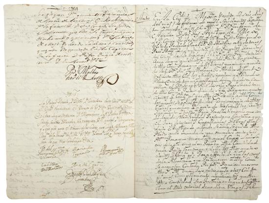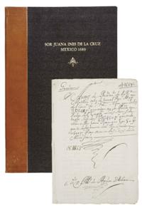 Subasta 710, Lote # 207 EC - MANUSCRITO DE I689 DE LA GRAN POETISA MEXICANA, SOR JUANA INÉS DE LA CRUZ, FIRMADO TAMBIÉN POR SU ARCHI ENEMIGO, EL ARZOBISPO DE MÉXICO, FRANCISCO AGUIAR Y SEIJAS, DE EXTREMA RAREZA: NO ESTA EN WORLDCAT, ABPC, PALAU, ETC. SOLO ENCONTRAMOS ALGO PARECIDO, DE INFERIOR IMPORTANCIA, VENDIDO HACE 9 AÑOS POR UNA NOTABLE LIBRERÍA ANTICUARIA DE LA CIUDAD DE FILADELFIA, EEUU., EN US $ 17,500.00. Cruz, Sor Juana Inés de la. Ciudad de México, a Veinte y Seis días del mes de Henero de mil Seiscientos y Ochenta y nueve años; febrero 8 de I689, y 26 de febrero de I689. Se trata de 3 documentos manuscritos con un total de I2 páginas, 3 de ellas con vuelta en blanco, de 2I.5 x 3I.5 cm. Relacionado con asuntos contables. En el documento correspondiente a febrero 26; un Auto del Arzobispo de México Aguiar y Seijas, mismo que al final firma el propio obispo. El texto fechado febrero 8, que escribe y firma Sor Juana, en I0 líneas es el siguiente: "…Y-lustrisimo S-eñor. La Prioria y Vicaria, y Defini--, y Contadora de este Convento de N. Señor San Geronimo obedeciendo el Decreto de Vuestra Ilustrísima (Aguiar y Seijas), Decimos que Es Cierto Lo que Informa nuestro Mayordomo Y Asi Podra, Vuestra Ilustrísima (el mismo arzobispo Aguiar y Seijas), Siendo Servido Mandar Se Le entreguen Dichos quatro y Cincuenta que pide para el adereso de las Cassas pues Con eso Faltaran los cinq-uenta de las Tassas de S-u M-ajestad V-uestra I-lustrisima Prove-ra Lo que fuere Servido Sera lo que mas Conbenga V-tra me-ced.". Siguen las firmas y rúbricas de: Jua-na del ss-antisimo Sacramento Pr-io-r-a Vicaria. María de T- ygnacio. Margarita de San Geronimo. Casilda de S-a-n Martin, Ana de S-n Geronimo y JUANA INÉS DE LA CRUZ, CONTTADORA. Excepto el autógrafo de Sor Juana, las otras firmas escritas con dificultad. Documento en papel, en excelentes condiciones, muy legible en español del S. XVII. Agrupado con hilo original. Conservado en gran carpeta, 28 x 44 cm., holandesa moderna, con título y adornos en dorado. Juana Inés de Asbaje y Ramírez: Nació: San Miguel de Nepantla, México, noviembre I2 de I65I - Murió a los 44 años, en la Ciudad de México, el abril 7 de I695. Niña prodigio, aprendió a leer y escribir a los 3 años de edad. Documentos firmados por la insigne Sor Juana son muy raros, más aun cuando, además de su firma y rúbrica completa; 4 cm. de alto, por 6.5 de largo, escribe con su puño y bella letra el documento que suscribe, y que arriba se transcribe completo, como Contadora del Convento de San Jerónimo en la ciudad de México. El interés adicional de este documento, es que las diversas decisiones son suscrita por personajes, hombres y mujeres de la Nueva España, en especial el célebre Arzobispo de la Ciudad de México y enconado enemigo de Sor Juana: Francisco, Arzobispo de México, Aguiar y Seijas (La Coruña, I632 - Ciudad de México, I695). Este hombre envidioso, no descansó de sus afanes perversos para destruirla desde I685, hasta I695, cuando muere la eximia poetisa al haber contraído el cólera por atender a sus compañeras monjas enfermas, pero sin duda contribuyó a su prematura muerte, la tristeza que le provocó su perseguidor, el obispo misógino. Adquirido hace 29 años, en I985, en la ciudad de México de la colección de un notable numismático mexicano, QEPD. WorldCat/OCLC (2 billones de referencias): no. A nivel mundial, lista 3,200 referencias de otras obras de esta autora, ningún manuscrito. American Book Price Current, referencia de subastas internacionales en los últimos 35 años: no. Palau: no. Abebooks a mayo, 20I4: no. La notable librería anticuaria de Filadelfia, USA, Philadelphia Rare Book and Manuscript Co., presentó en su catálogo hace 9 años, en 2005, un documento similar, pero solo con la firma y rúbrica de Sor Juana, sin texto escrito por ella. Dicho documento se vendió en US $ I7.500.00. PRECIO: US $ I5.750.00 ó su equivalente en pesos mexicanos, al tipo de cambio del día de su venta. Estimado $130,000-150,000