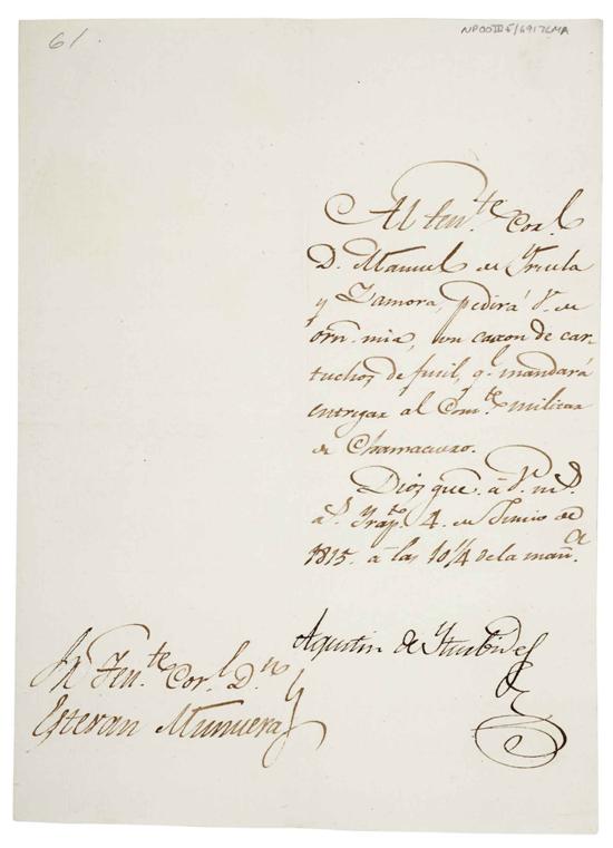 Subasta 710, Lote # 209 EE - DON AGUSTÍN DE ITURBIDE, FERVIENTE REALISTA: DESDE IRAPUATO PIDE EN 1815, UN CARTÓN DE CARTUCHOS DE FUSIL. MAGNÍFICO DOCUMENTO. Iturbide, Agustín de (1783 - 1824). Al Teniente Coronel Dn. Estevan Munuera. Documento de 14.5 x 20.5 cm. en impecables condiciones, solo con ligeras marcas de dobleces para el correo.13 líneas manuscritas con excelente tinta, muy legible, con la monumental firma y rúbrica manuscrita de Iturbide, de 6 de ancho x 4 cm. de alto. Conservado en folder especial libre de ácidos. "… Al Teniente Coronel D. Manuel de Yrula y Zamora pedirá V. de orden mía, un cartón de cartuchos de fusil, que le mandará entregar al Comandante Militar de Chamacuaro. Dios que á V. muchos años. Yrapuato 4 de Junio de 1815, á las 10 1/4 de la mañana. AGUSTÍN DE ITURBIDE. Firma. En este documento suscrito casi 6 años antes de su conversión a la causa insurgente, era fiel a la Corona Española. En 1800, Don Agustín ingresa al ejército colonial español. En 1810, se inicia la guerra de independencia y empieza su lucha en favor de España, para 1820, tenía el rango de Coronel. En febrero de 1821, firma con Vicente Guerrero el Plan de Iguala, crea el Ejército Trigarante, abraza la causa de la independencia y se vuelve el insurgente mas notable de ese tiempo, al firmar con el Virrey O`Donojù, en agosto de 1821, los Tratados de Córdoba, poniendo así fin a la guerra, y dándole a México su independencia. En 1838, fue declarado "Primer Héroe de la Independencia de México". Muy raro. WorldCat/OCLC: no. Localiza 238 referencias en idioma español de D. Agustín de Iturbide, entre los años de 1813 y 2011, pero ninguno del año 1815. Palau: no. Abebooks, a mayo de 2014: no. Estimado $20,000-25,000