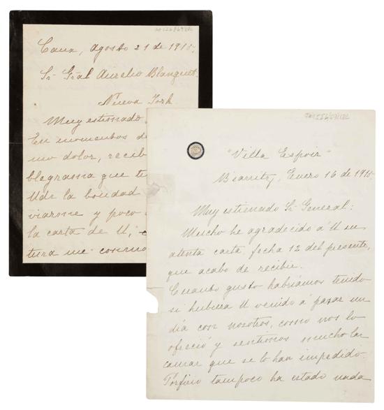 Subasta 710, Lote # 210 EF - LA FIDELIDAD Y AMOR DE LA MUJER MEXICANA EN LOS INICIOS DEL SIGLO XX: DOS CARTAS MANUSCRITAS DE DOÑA CARMEN ROMERO RUBIO Y CASTELLÓ DE DÍAZ, DESDE EL EXILIO EN FRANCIA, AL GENERAL AURELIANO BLANQUET, EXILIADO EN NUEVA YORK. LA PRIMERA ESCRITA DESDE BIARRITZ, FRANCIA, 4 1/2 MESES ANTES, Y LA SEGUNDA DESDE CAUX, FRANCIA, UNOS DÍAS DESPUÉS DE LA MUERTE DEL GENERAL PORFIRIO DÍAZ MORI. Romero Rubio y Castelló de Díaz, Carmen. Cartas dirigidas al Sr. General Aureliano Blanquet. Primera carta: 15 x 19.5 cm. En papel con pequeño escudo en dorado, plata y color, con las iniciales de Doña Carmen Romero Rubio y Castelló de Díaz. 4 páginas, 3 manuscritas, muy legibles con letra impecable, 1ª página: 12, 2ª, 16, y 3ª, 15 líneas manuscritas. "… Villa Espoir (Villa Esperanza…). Biarritz, Enero 16 de 1915. Muy estimado Sr. General: Mucho he agradecido a U su atenta carta fecha 12 del presente que acabo de recibir. Cuanto gusto habríamos tenido si hubiera U. venido á pasar un día con nosotros, como nos lo ofreció y sentimos mucho las causas que se lo han impedido Porfirio no ha estado nada bien de salud últimamente. El Dr. Lavergue lo atribuye en gran parte, á su permanencia tan prolongada á la orilla del mar. No considera prudente que permanezca mas tiempo en Biarritz y nos ordena que nos alejemos de aquí, cuanto antes. Esta determinación del Dr. nos priva muy á nuestro pesar del gusto de ver á U. aquí, en los primeros días del mes entrante, como nos indica en su amable carta. No tiene U. idea de la pena y contrariedad que esto le causa a Porfirio pues U. sabe cuanto lo estima y que tendría positivo gusto en verlo. Me encarga decirle á U. de su parte y que espera tener mas tarde ese gusto. Nos vamos a Pau en donde nos quedaremos unos días y de ahí seguiremos para París. Con nuestros saludos á su estimable familia y un afectuoso recuerdo de Porfirio para U., quedo su afma. S.s. que lo estima. Carmen R. R. de Diaz. Firma. La carta en muy buen estado, solo perforaciones para archivo, en margen izquierdo, debidamente reparadas, sin afectar texto, y ligeras manchas del tiempo. Segunda carta: 13.5 x 18 cm. En papel de luto: marco en color negro. 4 páginas, 3 manuscritas, muy legibles, buena tinta y letra. 1ª página: 11, 2ª, 12, 3ª, 12 líneas manuscritas. "… Caux (Sur de Francia), Agosto 21 de 1915. Sr. Gral. Aurelio Blanquet. Nueva York. Muy estimado Sr. Gral.: En momentos de supremo dolor, recibí el cablegrama que tuvieron Uds. La bondad de enviarme y poco después, la carta de U., cuya lectura me conmovió hondamente. Agradezco de todo corazón el recuerdo cariñosísimo que consagra U. á la memoria de su amigo verdadero, que tanto lo estimó. Espero como U. dice que algún día brillarán para él la verdad y la justicia y creo que el Señor, en su misericordia, le habrá dado ya la recompensa, por las muchas obras buenas que hizo en su vida. Esto es lo único que puede darme algún consuelo en mi inmensa pena. Repitiéndole mis agradecimientos, quedo de U. afma. y sincera amiga. Carmen R. R. de Díaz.". Firma . Carta en excelentes condiciones. Solo un doblez para su envío por correo, limpia, sin manchas. La noble señora, Doña Carmen Romero Rubio y Castelló (1864 - 1943), mujer de familia acaudalada e impecable educación, hija del abogado y político lerdista, ministro de relaciones exteriores, Don Manuel Romero Rubio y ministro de gobernación durante el porfiriato, casó con el General Don Porfirio Díaz Mori, (1830 - 1915) viudo, el 7 de noviembre de 1881, a los 17 años de edad, y el General Díaz Mori de 51. Esta diferencia de edad, 34 años, no impidió que Doña Carmen se convirtiera en una gran esposa, que sirvió amorosamente de madre de los hijos e hija del primer matrimonio de Don Porfirio, además de ayudarlo considerablemente a mejorar su ilustración social, con fuerte influencia europea, y énfasis en la cultura francesa, idioma que Doña Carmen, junto con el inglés, dominaba además del español. El 2 de julio de 1915, a los 85 años de edad, muere el Gral. Porfirio Díaz Mori en París, Francia. Doña Carmen muere en 1943, de 79 años, en la ciudad de México. Documentos personales, íntimos, sumamente raros, ya que son pequeños, escritos y remitidos en el extranjero, de Francia a EEUU, entre la esposa de un notable y célebre mexicano, Don Porfirio Díaz Mori, rechazado de México hasta la fecha, hace más de un siglo, y su entrañable amigo, el general Aureliano Blanquet (1849 - 1919), militar porfirista, asimismo considerado enemigo de México, ya que combatió la insurrección encabezada por Don Francisco I. Madero, en su calidad de ministro de Guerra y Marina del traidor Victoriano Huerta, quien lo nombró General de División, y además participó en la detención del Presidente Madero. Después del exilio (1914 a 1918), regresó a México a luchar contra Venustiano Carranza, y fue muerto durante un enfrentamiento. Adquiridos en estas salas en 1995, hace 19 años. No hay antecedente alguno en WorldCat/OCLC., ABPC., Palau y Abebooks, a mayo de 2014. Estimado $30,000-35,000