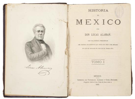 HM - Alamán, Lucas. Historia de México. México: Imprenta de Victoriano Agüeros y Comp., Editores, 1883 - 1885. 4o. marquilla, 495; 536; 567; 675; 840 p. Con una noticia preliminar del sistema de gobierno que regia en 1808 y del estado en que se hallaba el pais en el mismo año. Tomo I - Retrato del autor (pegado en guarda y rasgado), 6 retratos, una vista y un plano. Encuadernados en pasta dura, lomo en piel. Piezas: 5. Estimado $16,000-20,000