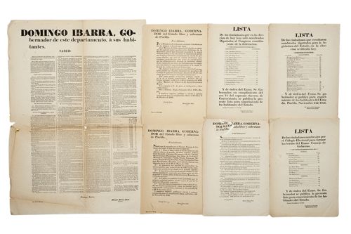 Subasta 710, Lote # 54 DI - Ibarra, Domingo / Zetina Abad, Manuel. Decretos y Listas sobre Elecciones de 1846. a) Ibarra, Domingo / Zetina Abad, Manuel. "...A sus habitantes sabed: Que por el ministerio de relaciones esteriores y gobernacion, se me ha comunicado el decreto que sigue...bases para las elecciones: celebración de juntas primarias o municipales, secundarias o de partido y de departamento; instalación del Congreso; y Prevenciones generales..." Puebla á 16 de agosto de 1846. Hoja rasgada en el centro, pequeño faltante, afecta texto, manchas de óxido. b) Ibarra, Domingo / Zetina Abad, Manuel. "...A sus habitantes sabed:... Art. 1o. Para el buen órden de las elecciones se consideran cabezas de partido, Acatlan, Amozoc, Atlixco... juntas secundarias y elecciones secundarias...". Puebla á 26 de Septiembre de 1846. c) Ibarra, Domingo / Zetina Abad, Manuel. "Domingo Ibarra, Gobernador del Estado libre y soberano de Puebla. A sus habitantes... No obstante lo prevenido en el art. 66 de la Convocatoria, pueden ser elegidos diputados los miembros del Consejo de gobierno creado por decreto de 20 del corriente para el Congreso nacional constituyente...". Puebla á 2 de Octubre de 1846. d) Ibarra, Domingo / Zetina Abad, Manuel. "...á sus habitantes sabed:... 1o. Luego de que se verifiquen las elecciones de siputados, dispondrán los gobernadores de los Estados, que los individuos que resulten electos emprendan imediatamente (sic) su marcha para esta ciudad, á cuyo fin les ministarán los viáticos y demas auxilios que necesiten...". Puebla á 31 de Octubre de 1846. Hoja rasgada en la esquina superior izquierda. e) Zetina Abad, Manuel. Lista de los Ciudadanos que en la Elección de hoy han sido Nombrados Diputados al Congreso Constituyente de la Federacion. Puebla, Noviembre de 1846. Piezas:3. Total de piezas: 7. Estimado $4,000-5,000